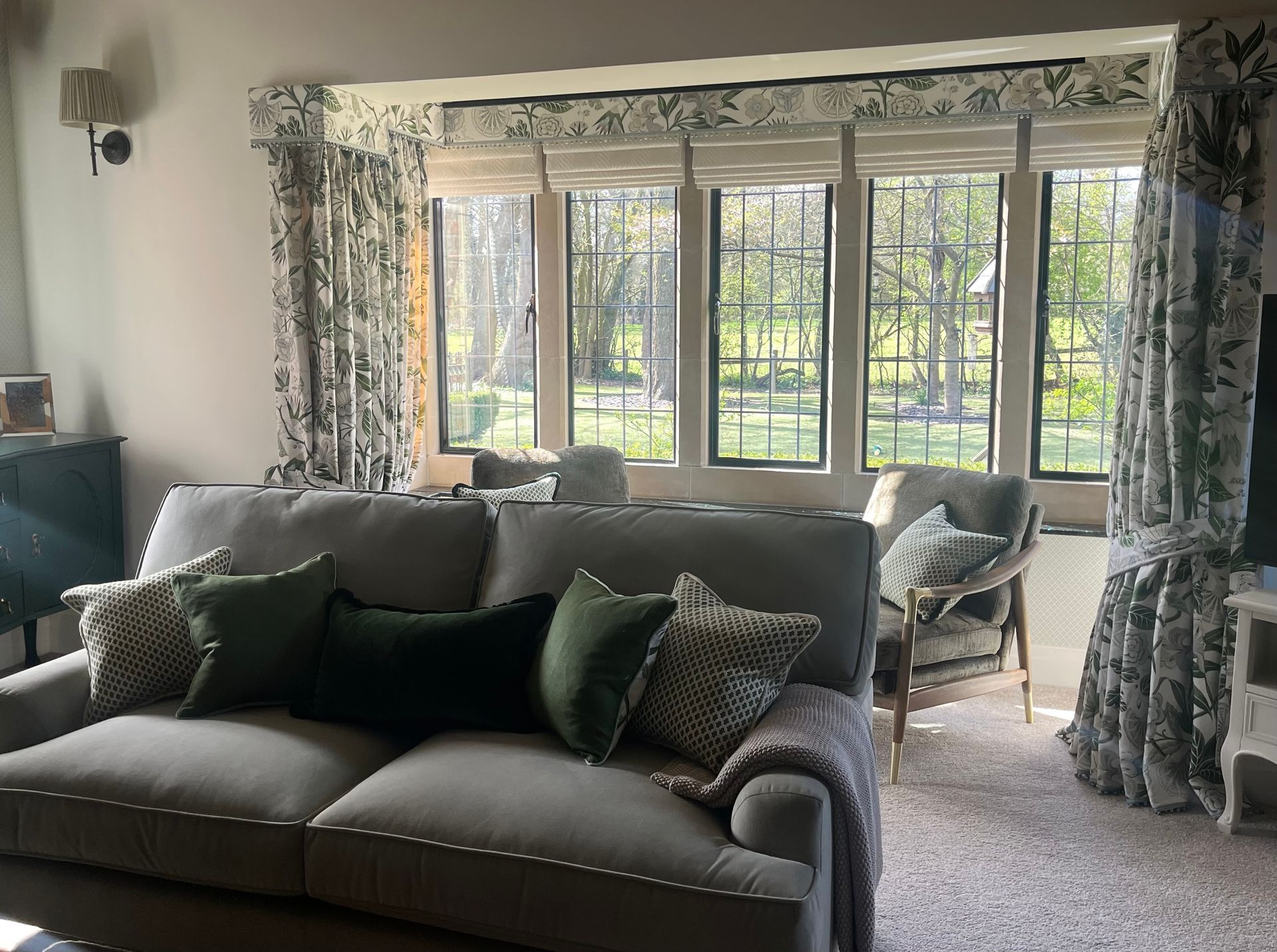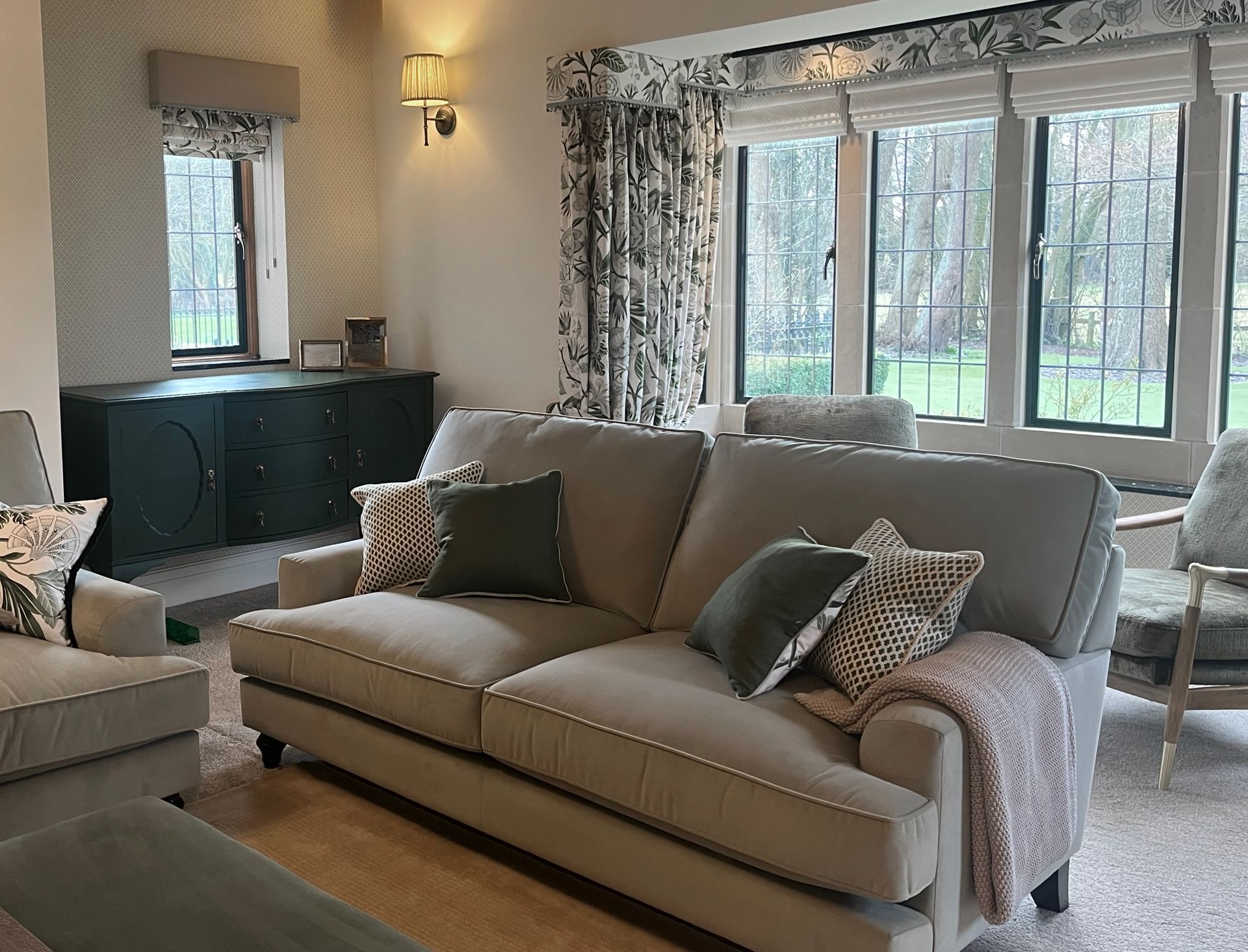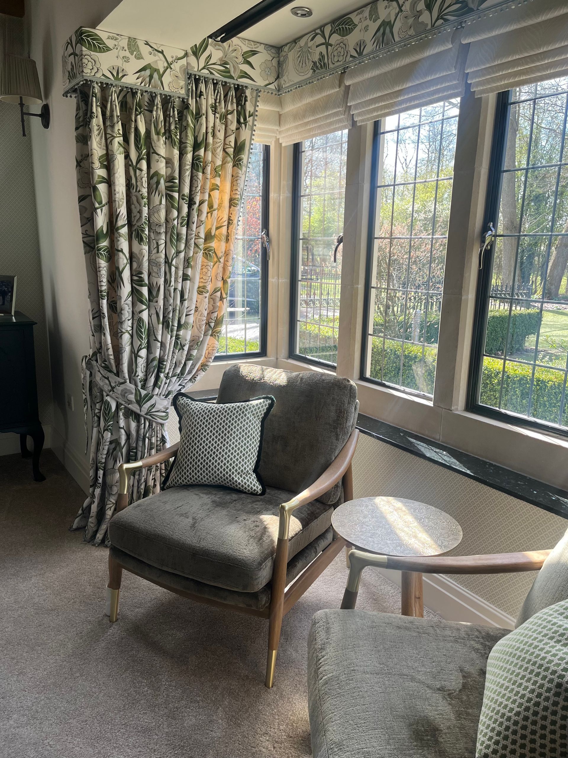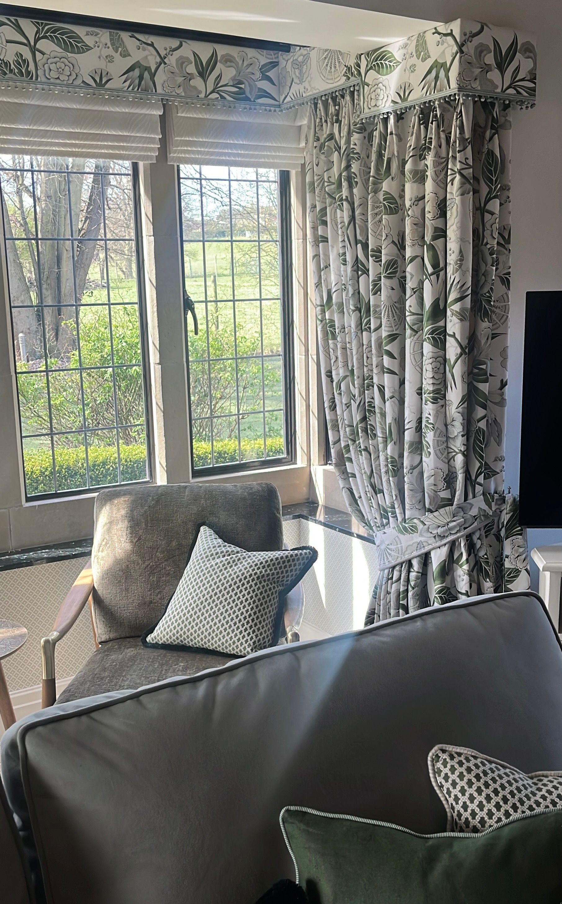 I made all of the bespoke window dressings, a key part of any room design, beginning with the bay window. This was fitted with seven motorised, double-lined cascading roman blinds in an off-white embroidered design, paired with pooled dress curtains and pelmet in a contrasting modern floral fabric. The leading and bottom edges of the curtains, along with the bottom edge of the pelmet, were finished with a hand-sewn bobble trim in a seafoam colour.