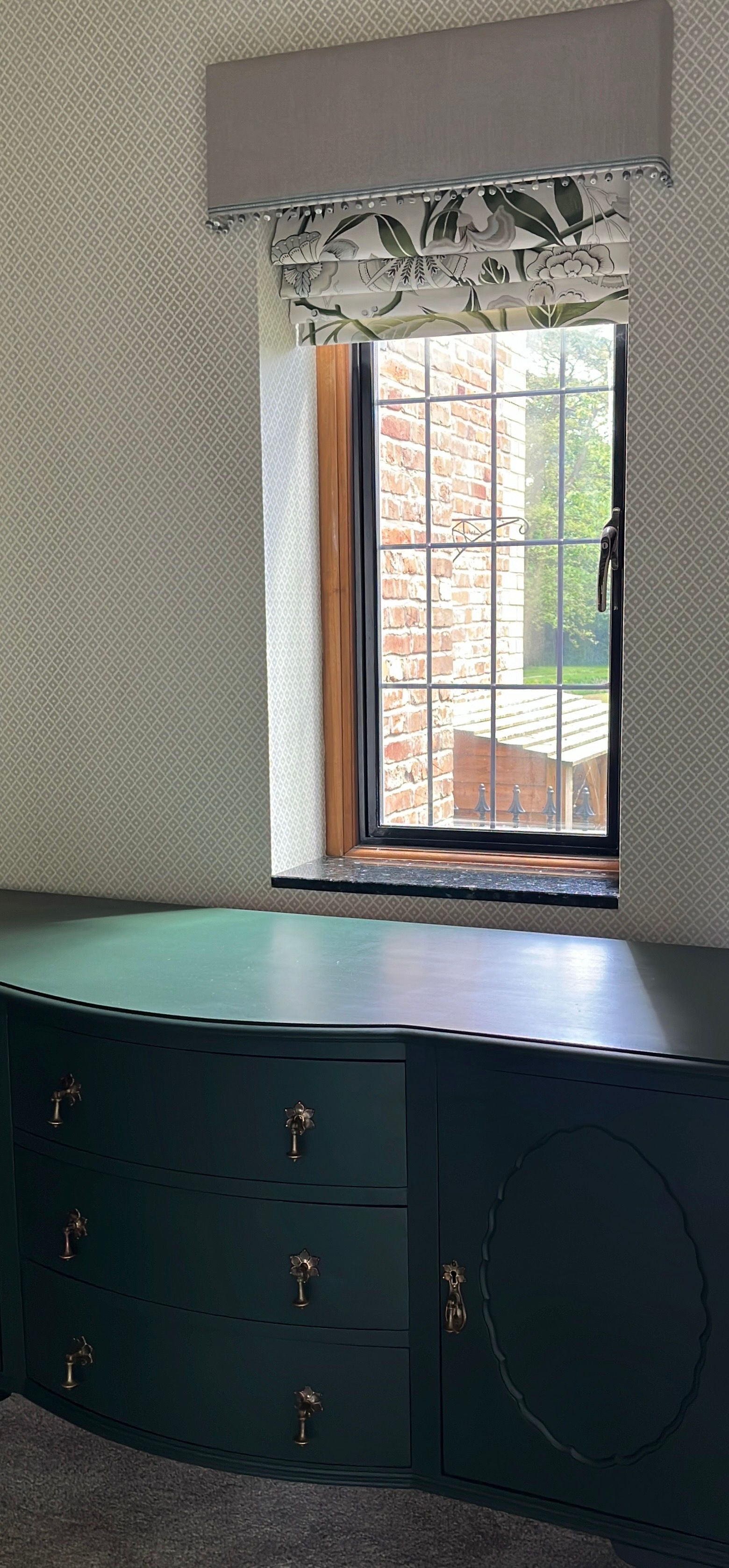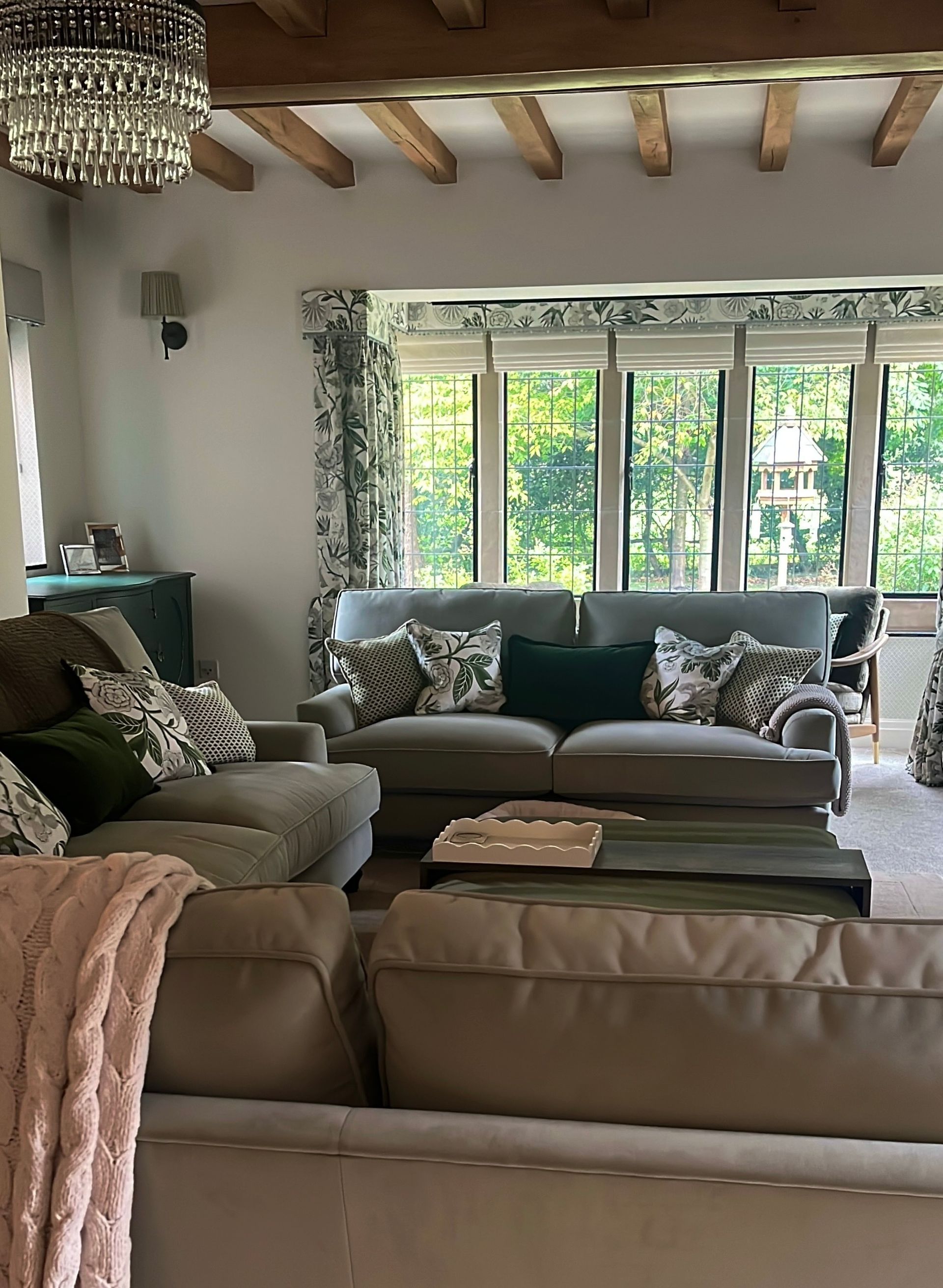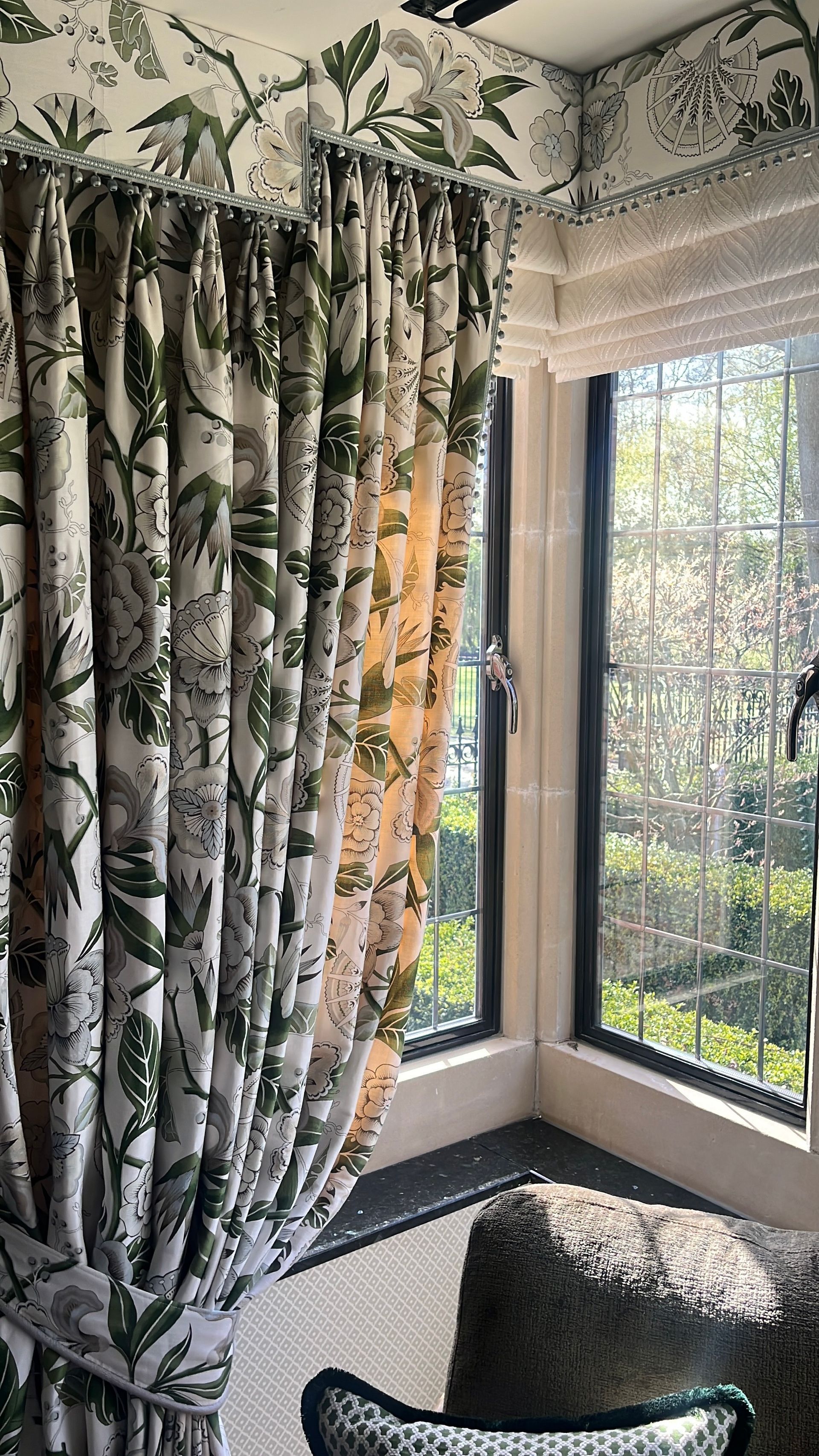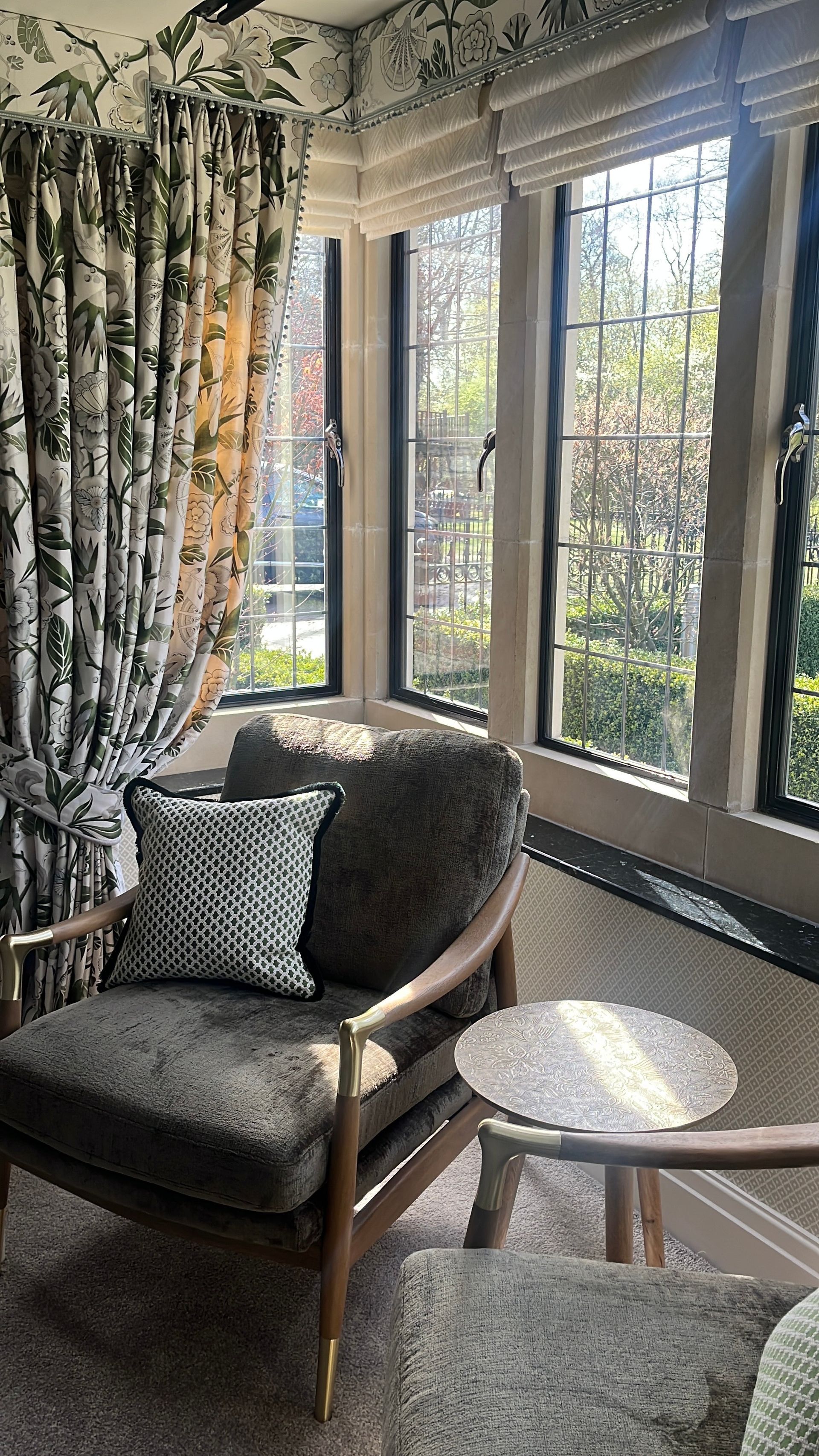 I made all of the bespoke window dressings, a key part of any room design, beginning with the bay window. This was fitted with seven motorised, double-lined cascading roman blinds in an off-white embroidered design, paired with pooled dress curtains and pelmet in a contrasting modern floral fabric. The leading and bottom edges of the curtains, along with the bottom edge of the pelmet, were finished with a hand-sewn bobble trim in a seafoam colour.