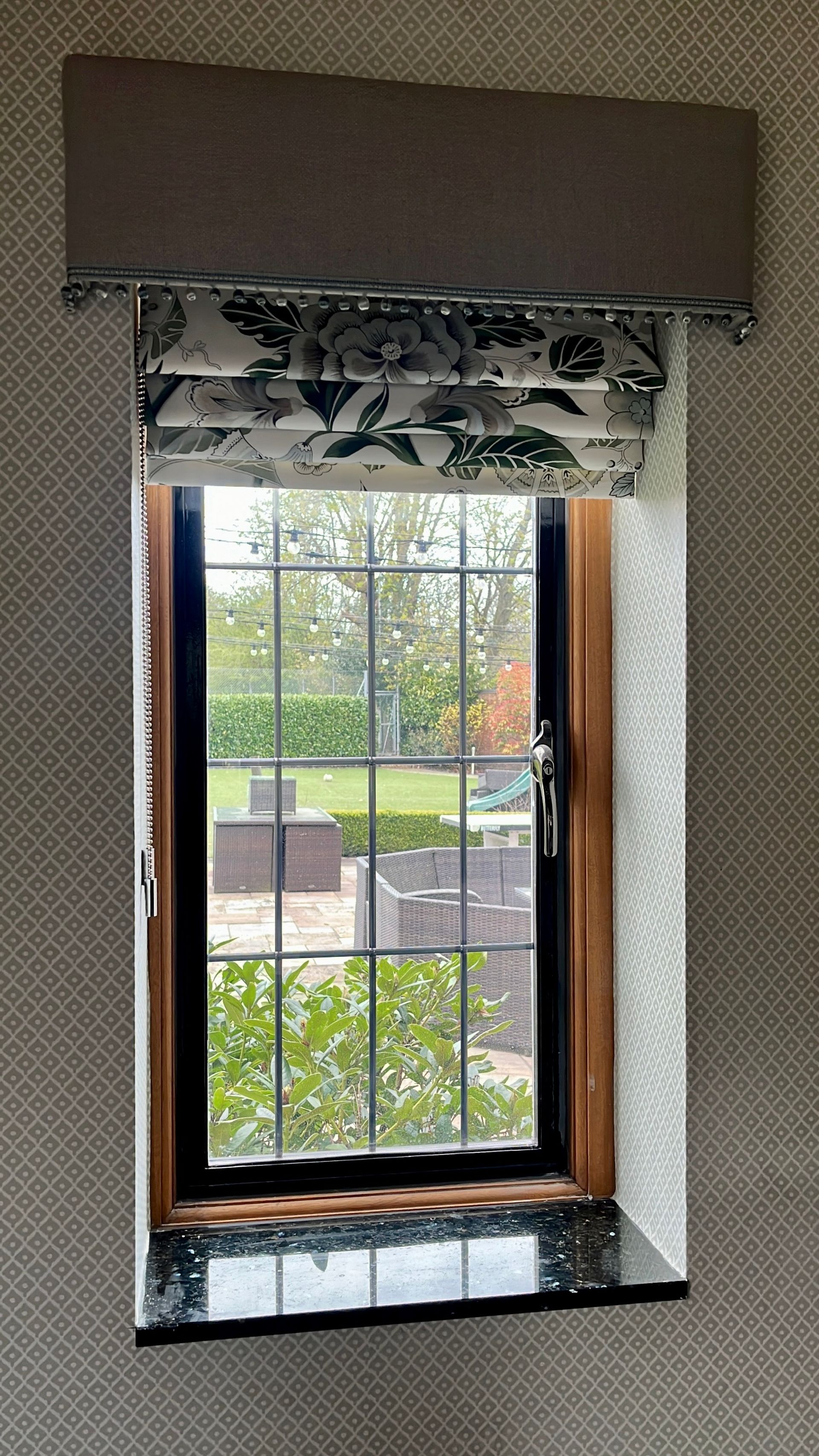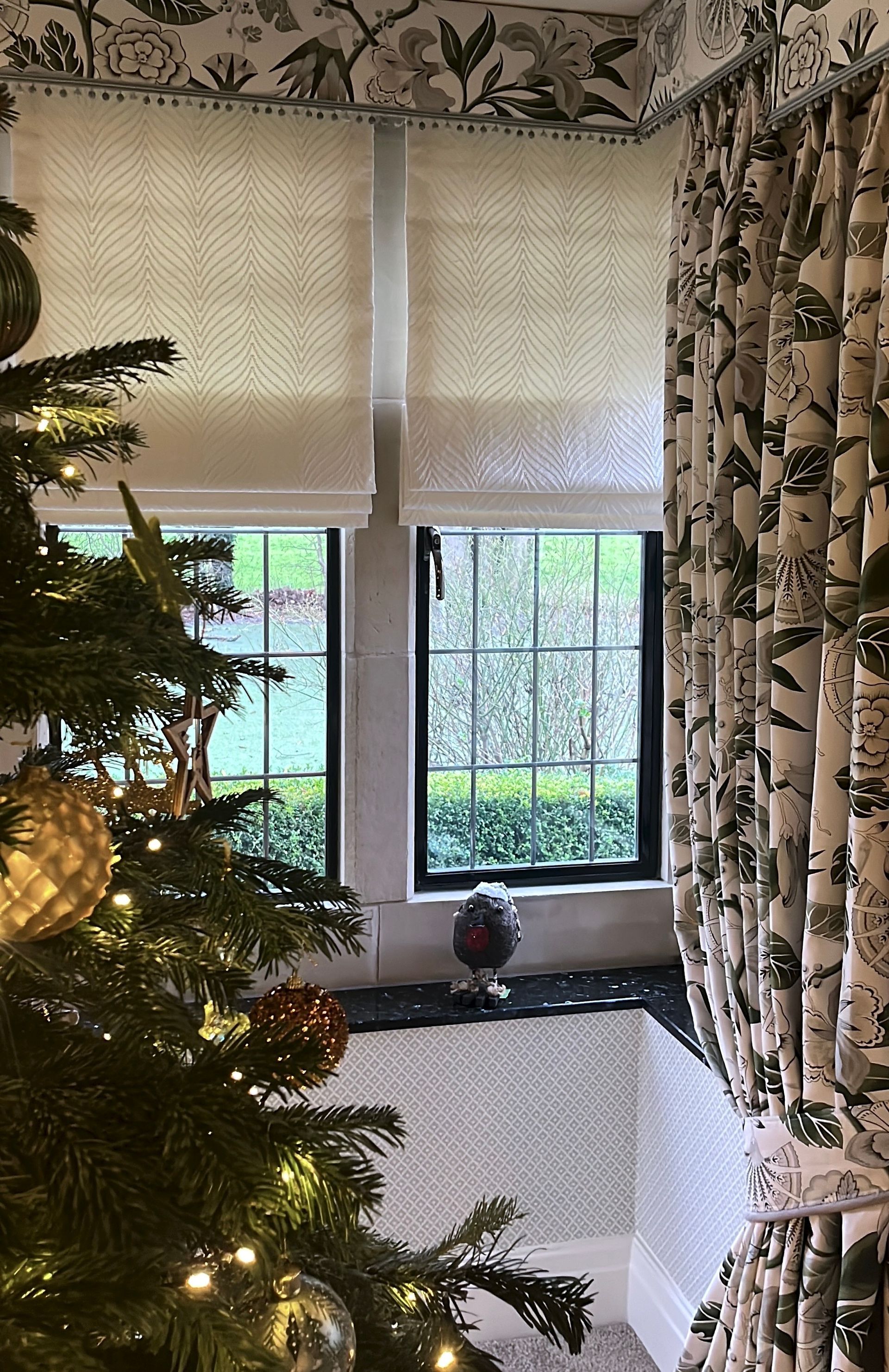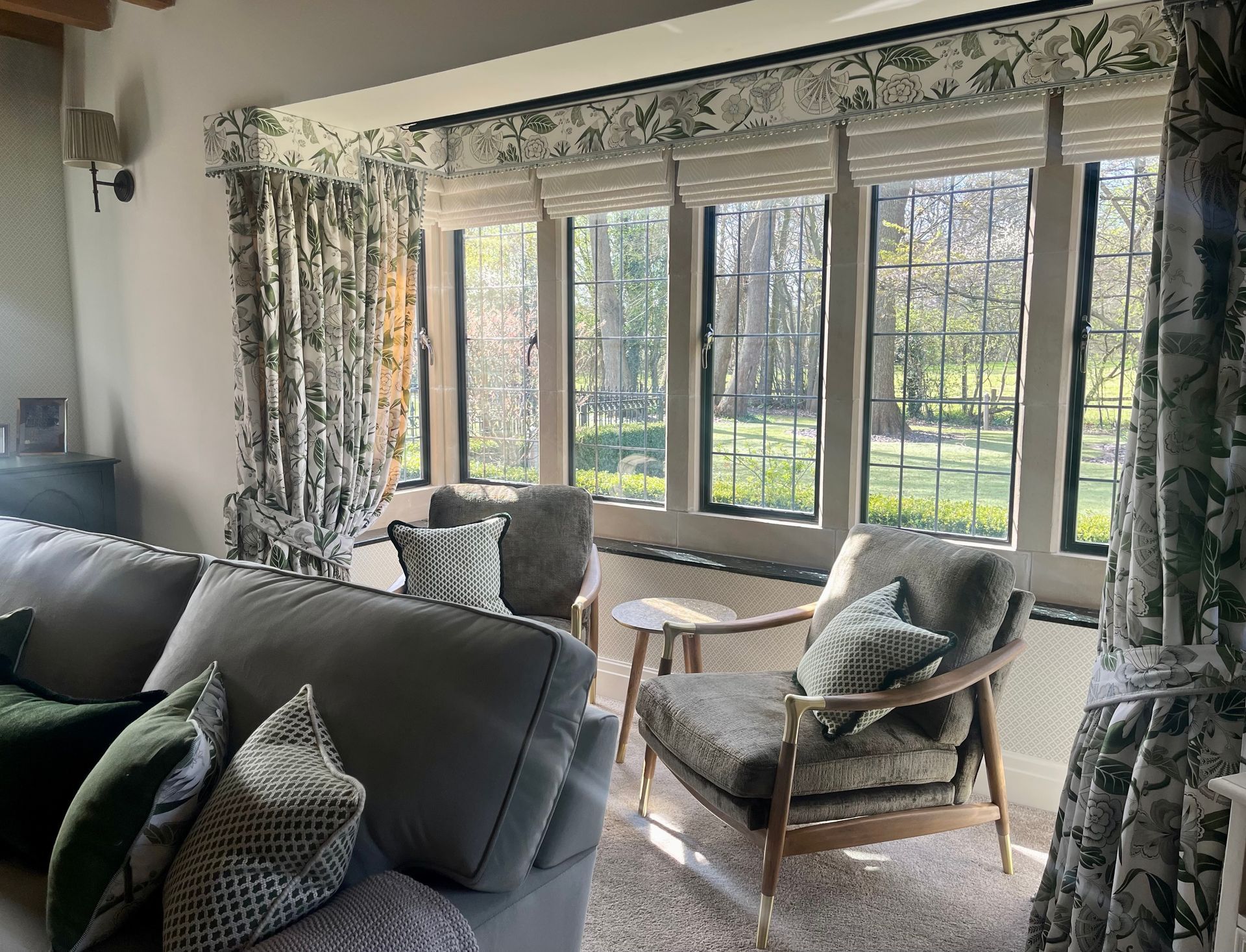 The smaller windows were dressed with double-lined cascading roman blinds in the same modern floral fabric, finished with pelmets in a complimentary linen and matching trim.
