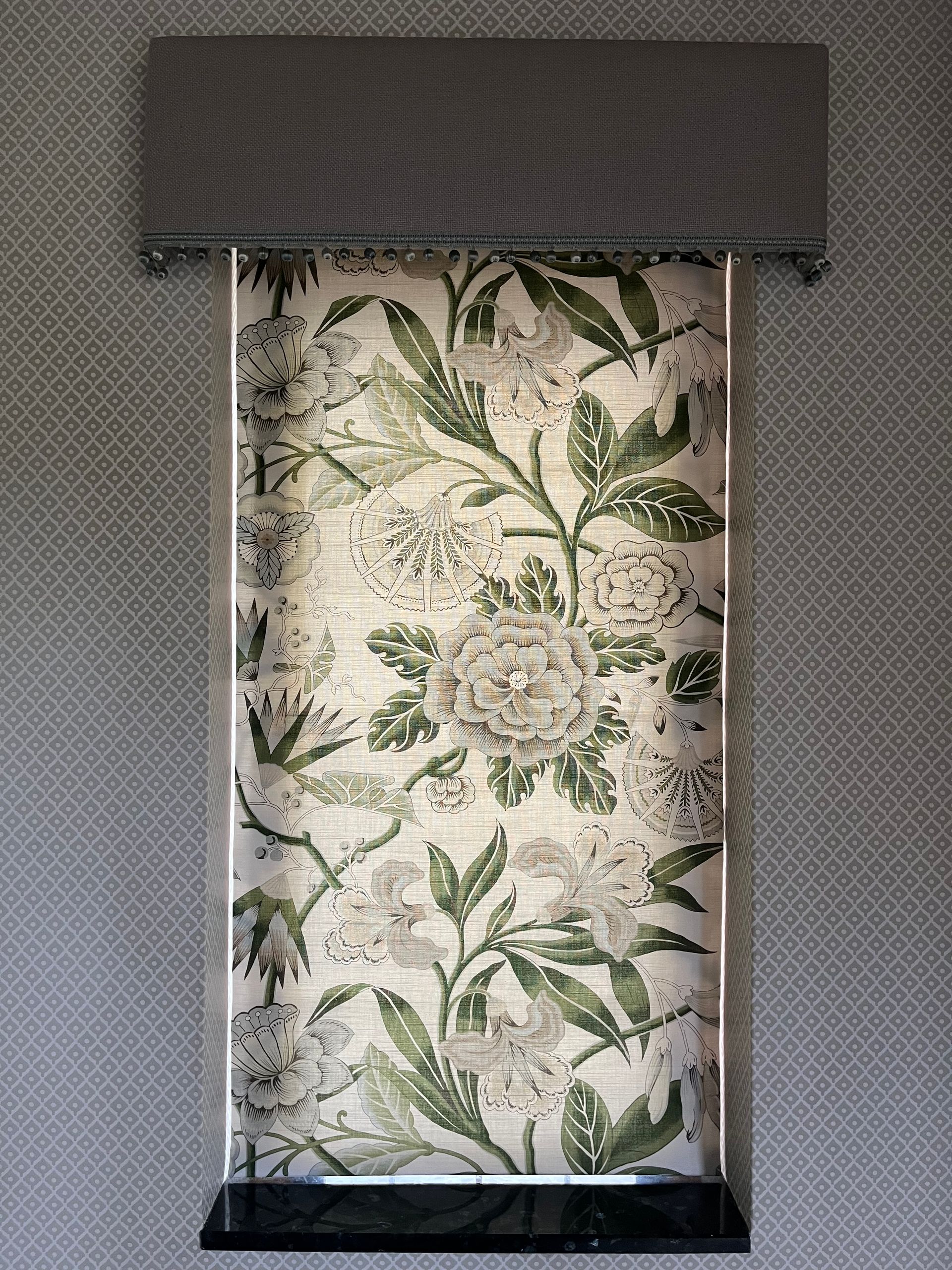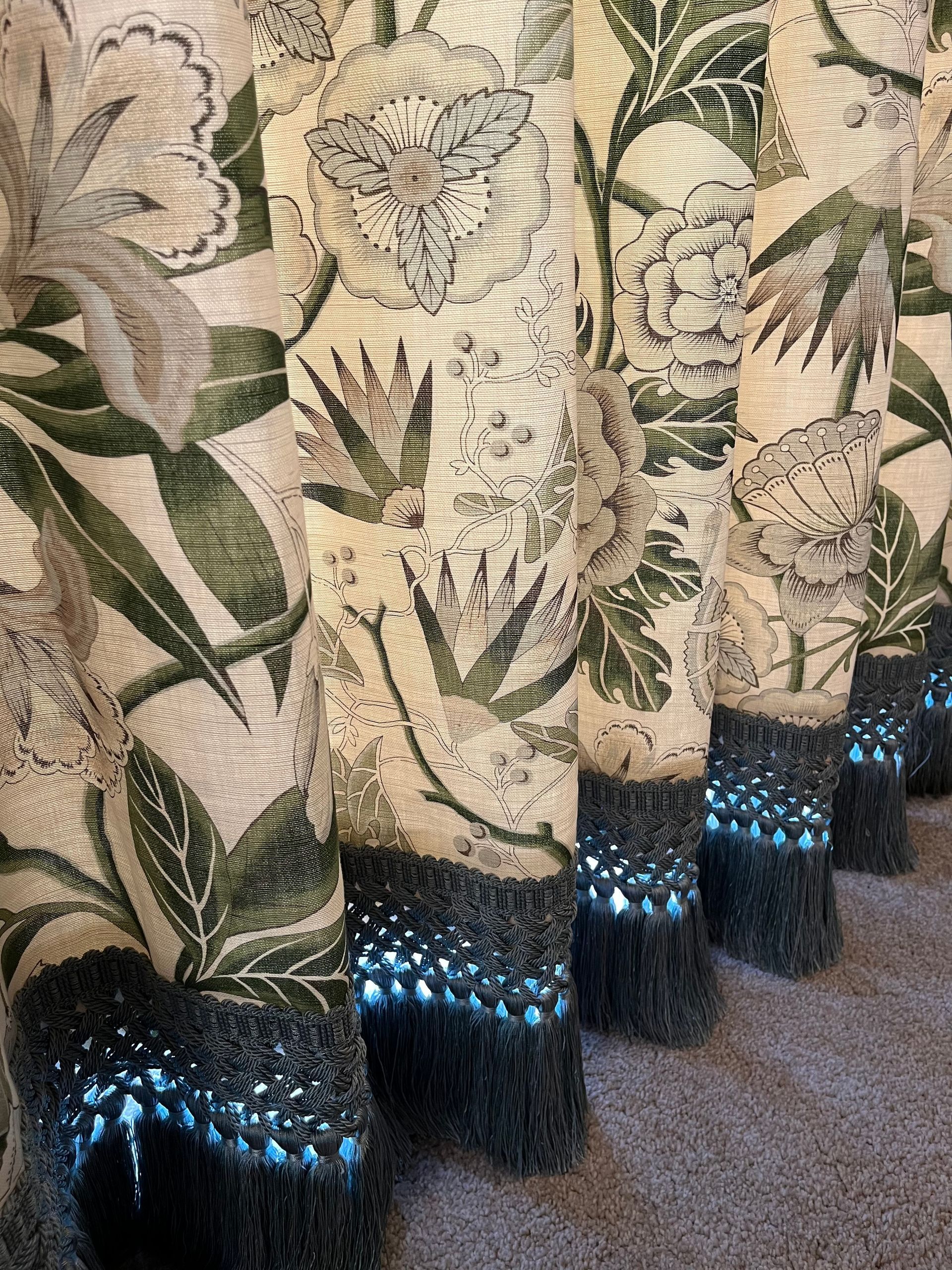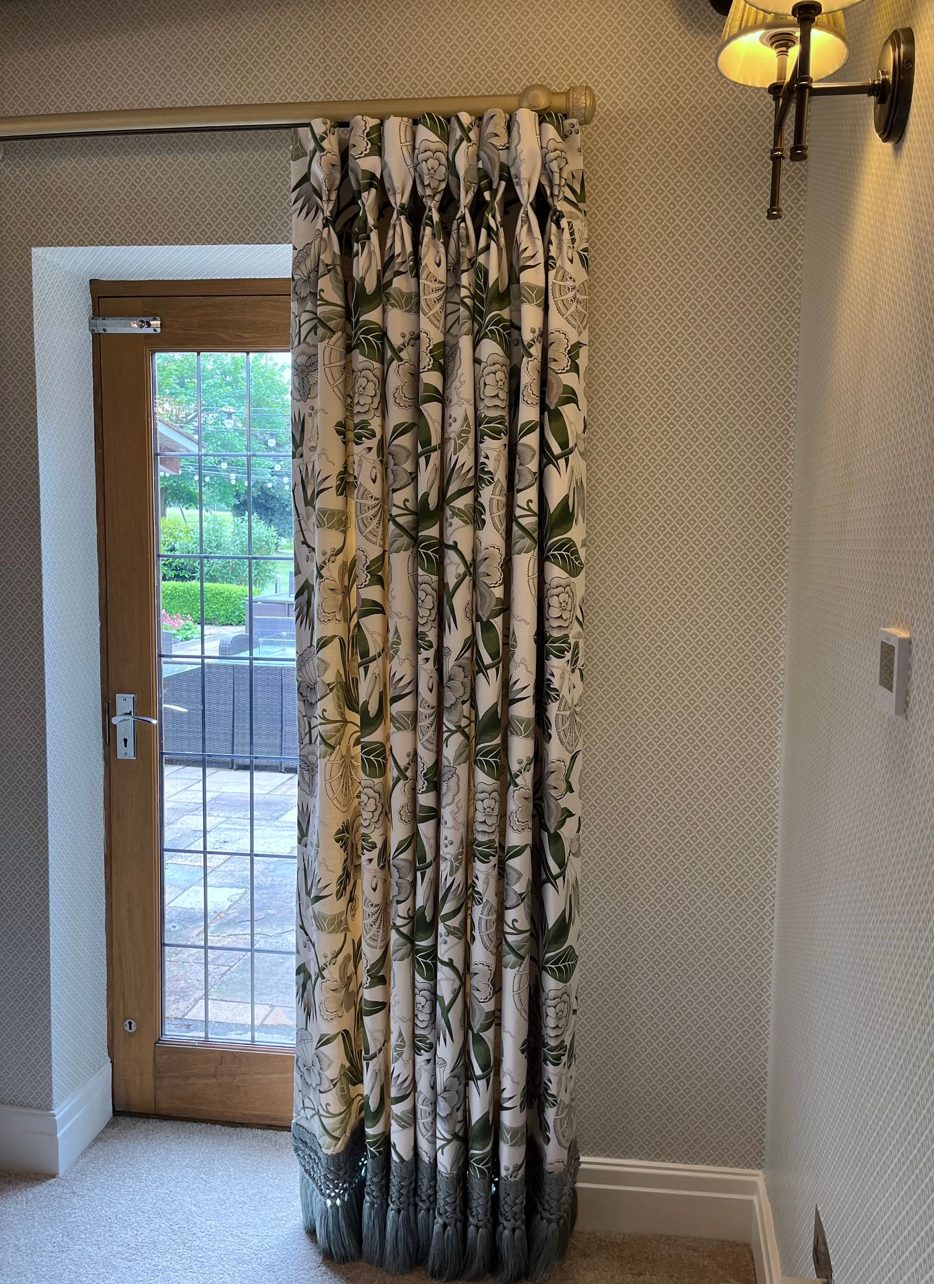 The doorway was finished with double-lined, floor-length curtains in the same modern floral fabric, with goblet headings and a long seafoam fringe trim along the bottom edge, adding a striking finishing touch. These were hung on a tracked pole to give a clean, modern look, with handmade tie backs in the same linen used for the window pelmets.