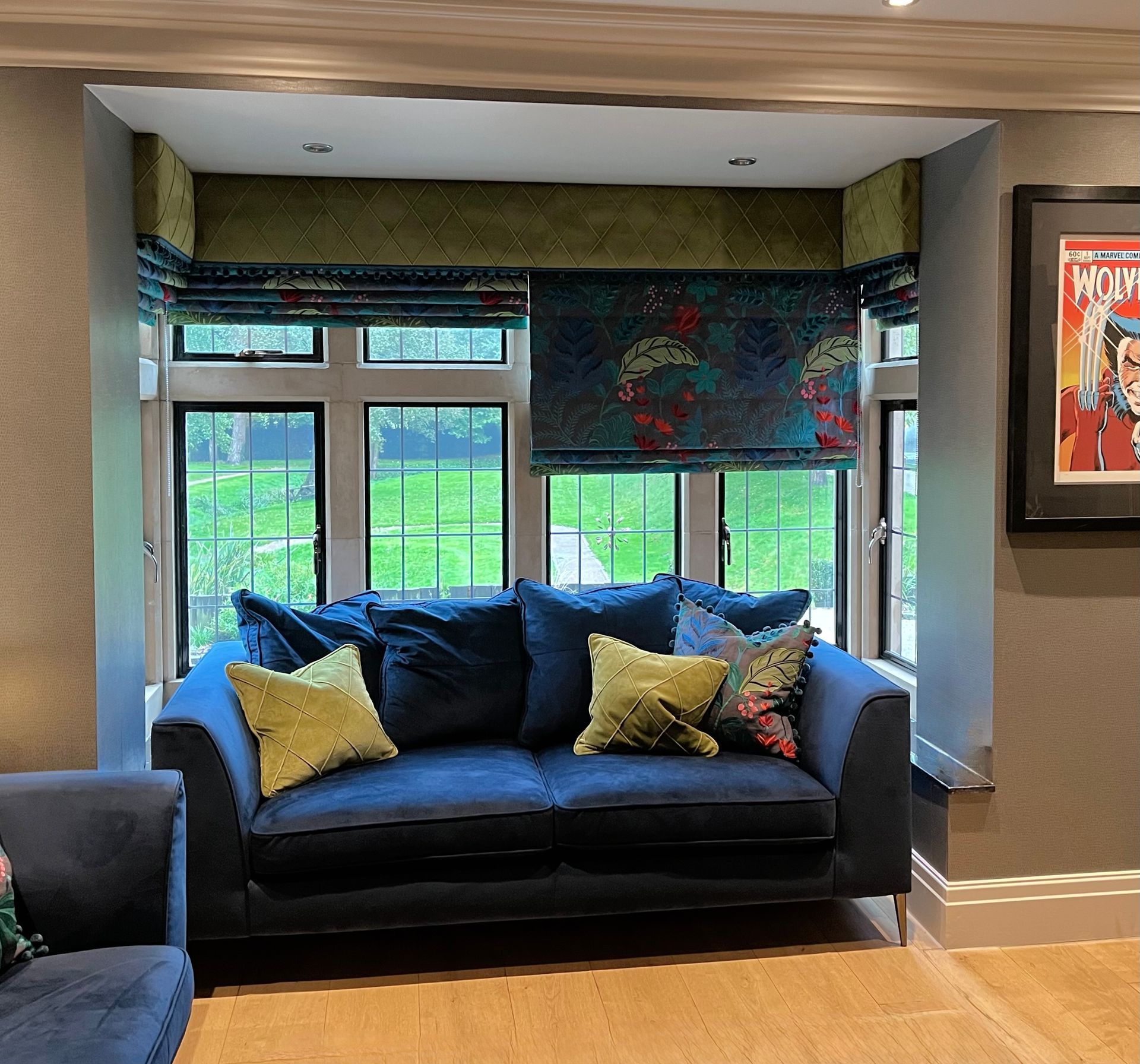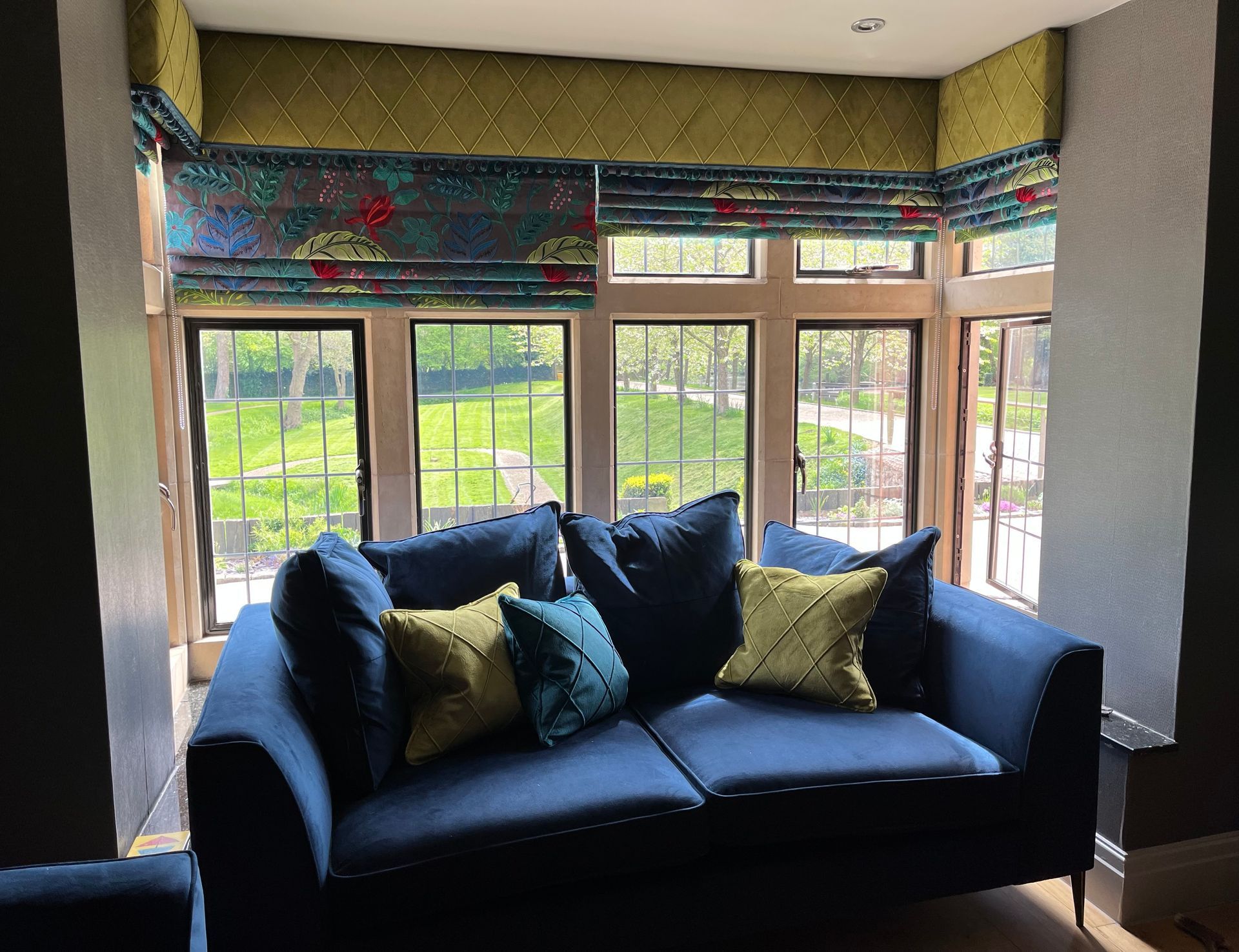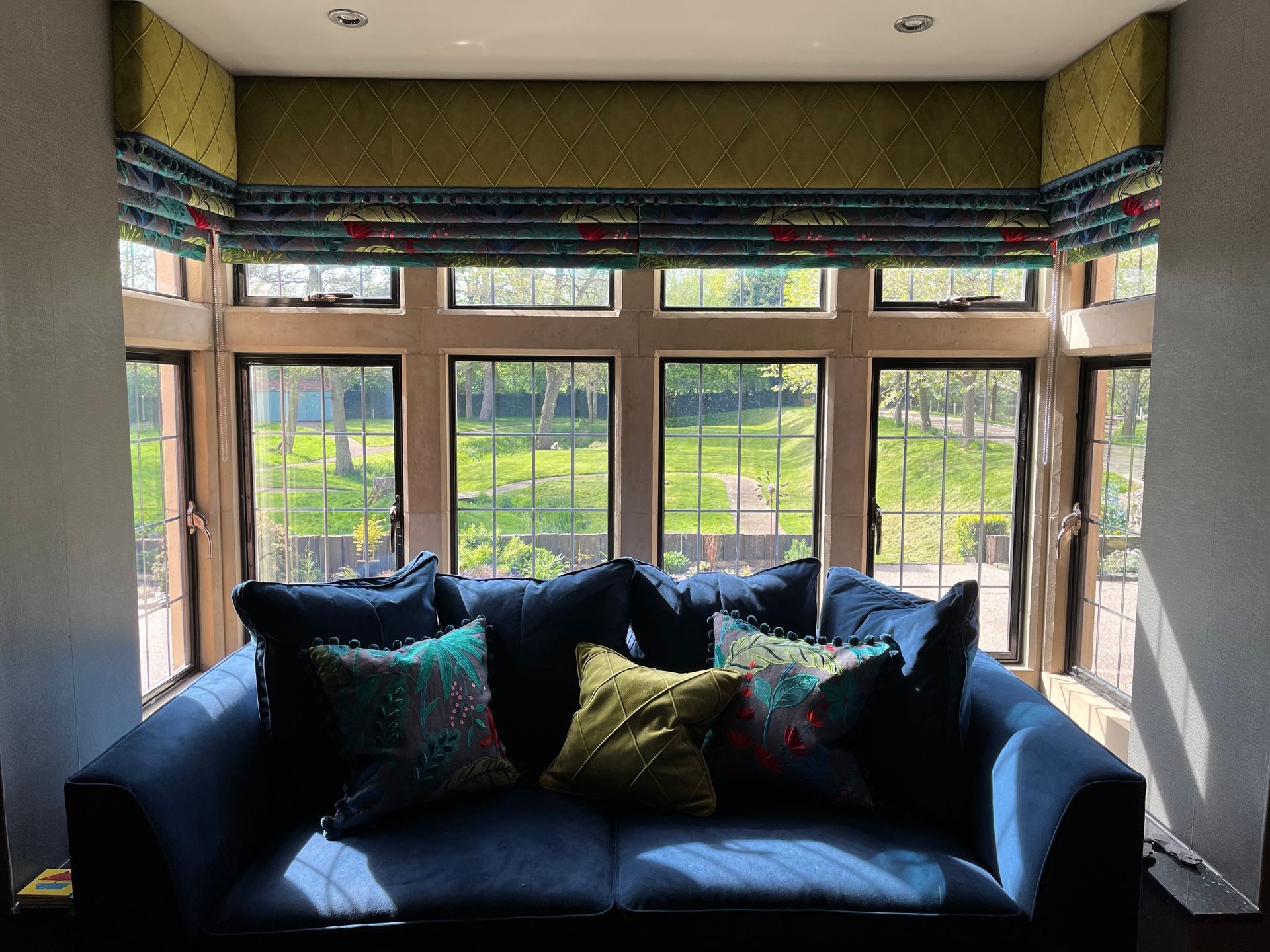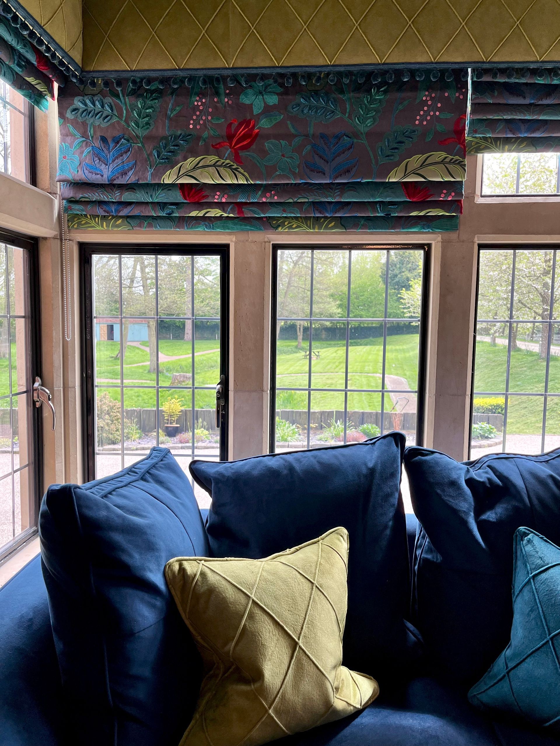 As usual all blinds are cascading, interlined and have rod pockets sewn into the lining, giving a neat finish when viewed from outside. I also felt the original pelmet was far too deep for the size of the window, so I reduced it to bring it into better proportion and allow the blinds to be seen underneath when drawn up. To complete the scheme I made cushions in the same fabrics, along with a few in a bright turquoise colour.
