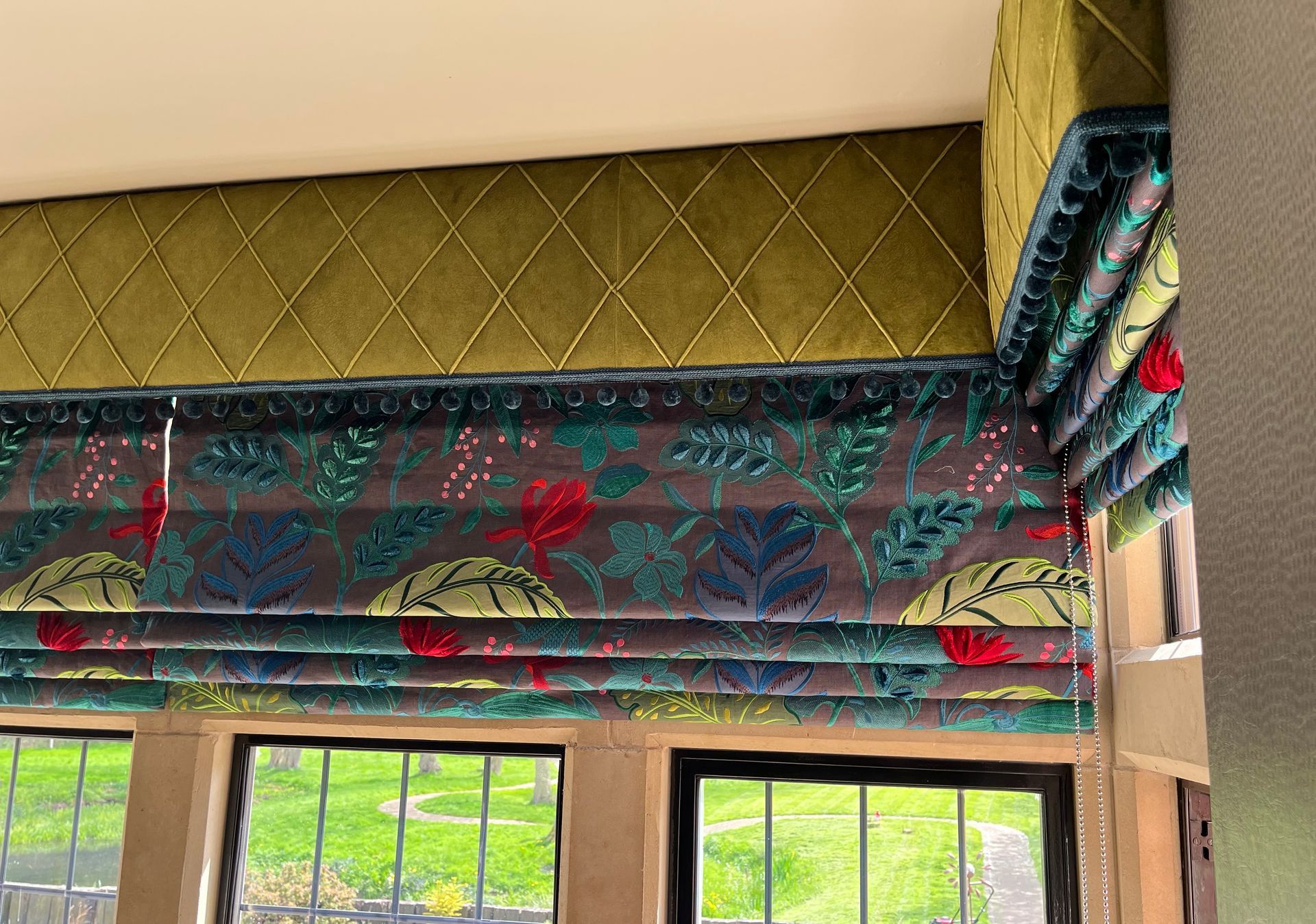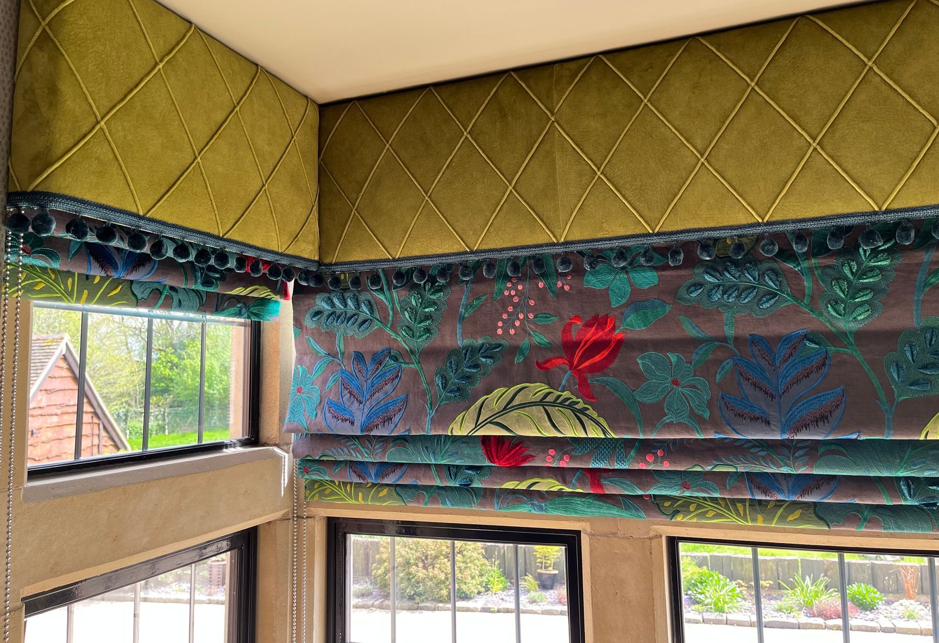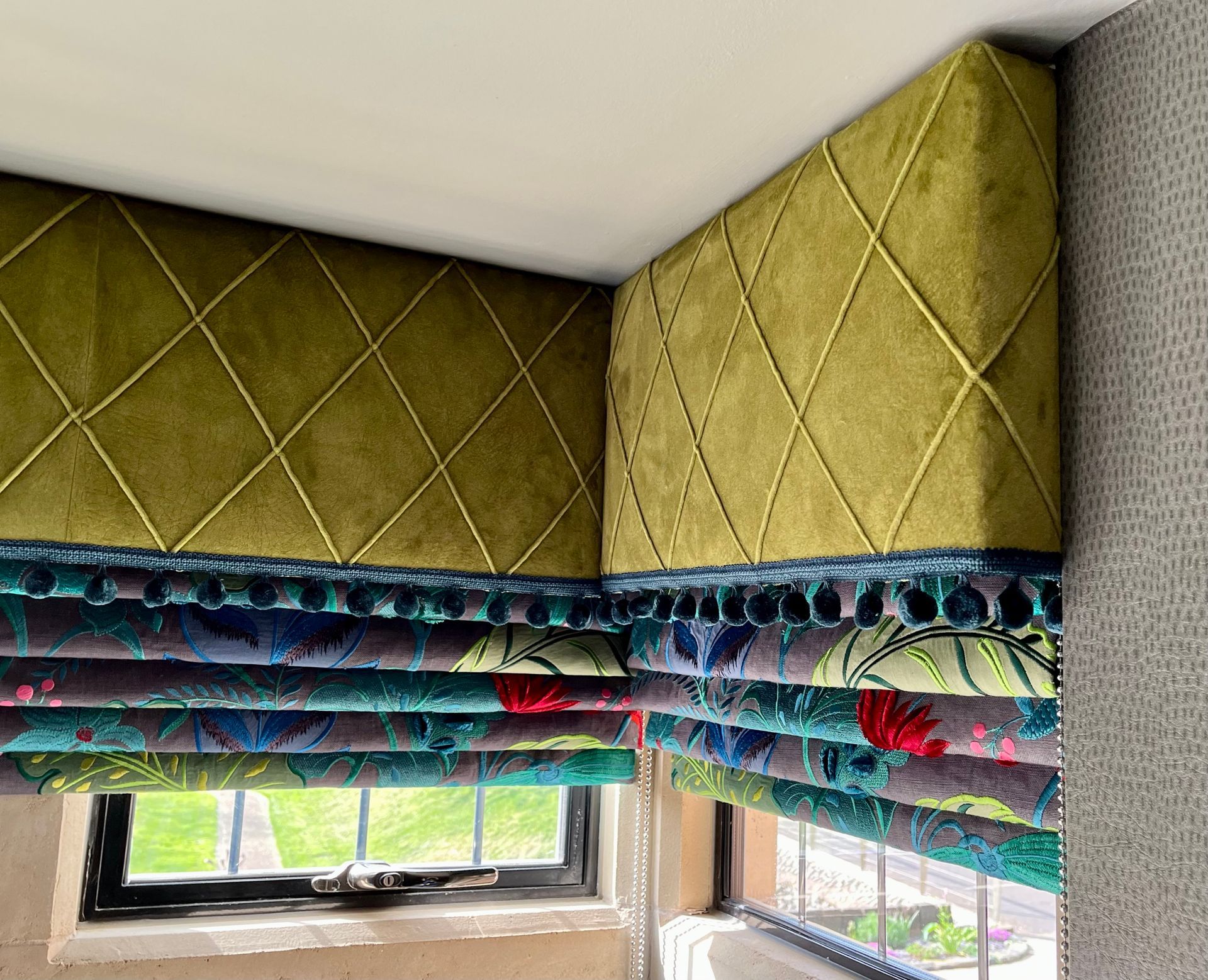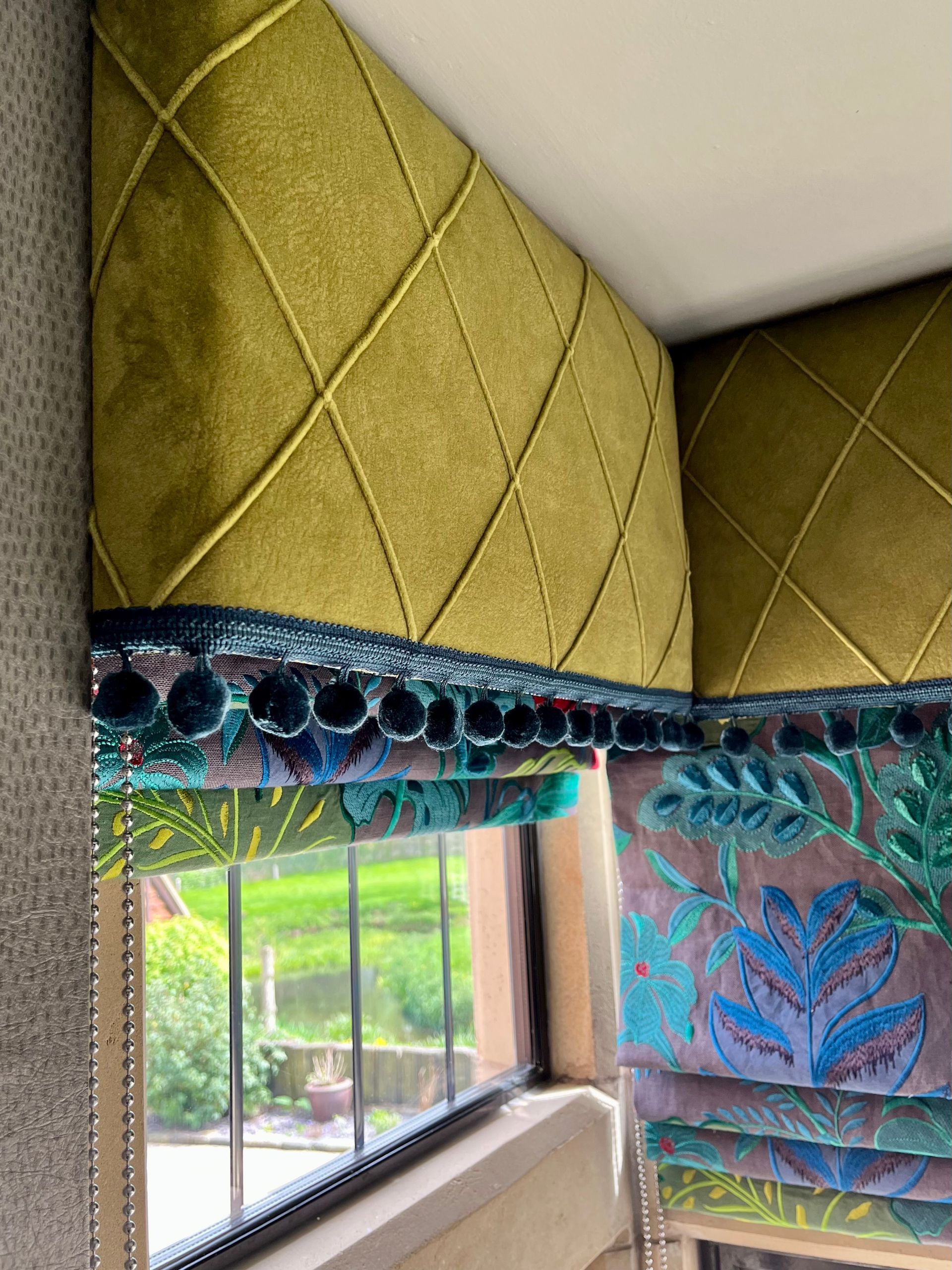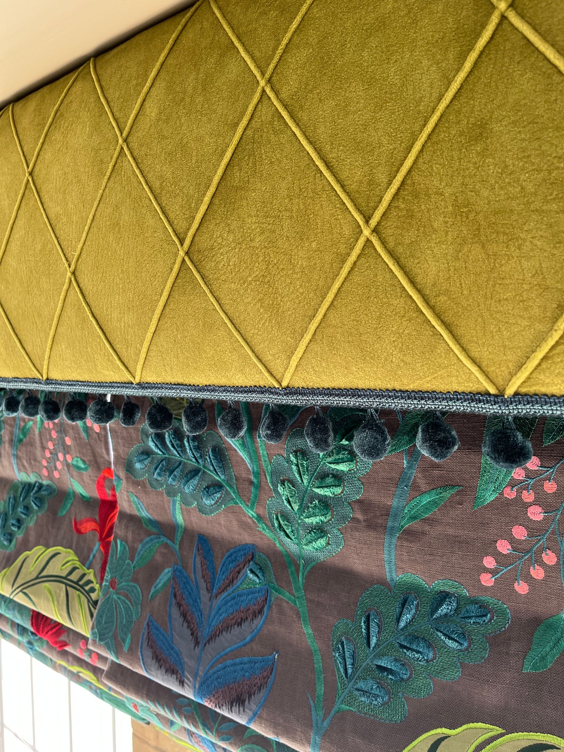 My client chose a bold chartreuse fabric for the pelmet which really popped against the darker grey walls. This was paired with a vibrant embroidered floral linen for the blinds, finished off with a pom pom trim along the bottom edge of the pelmet.